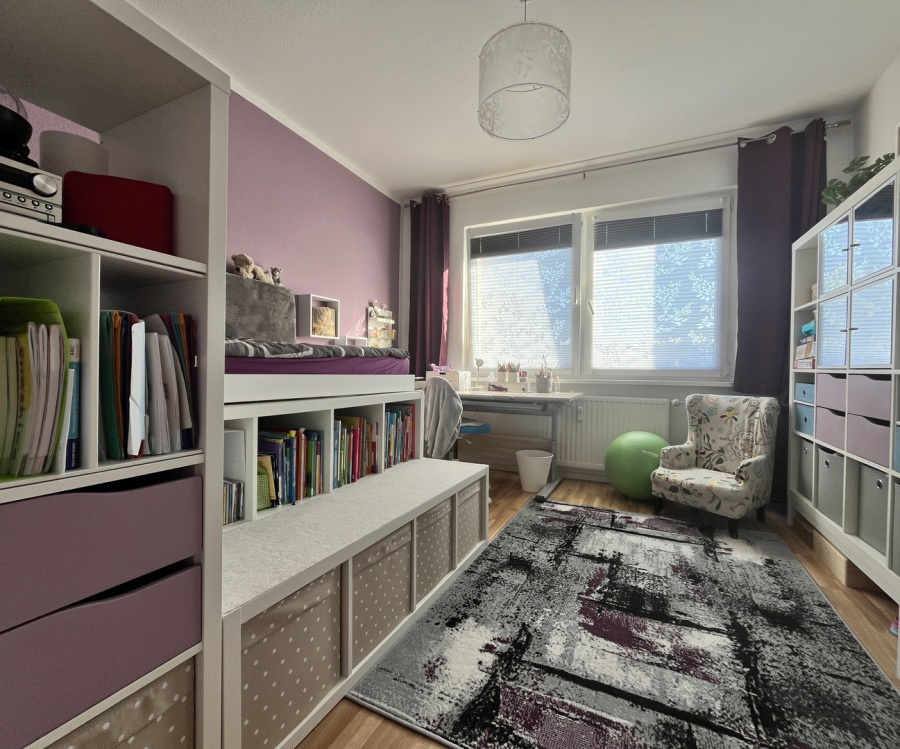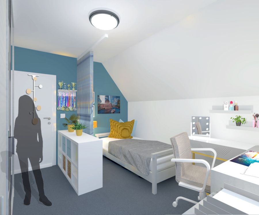 Für eine 4-köpfige Familie soll jedes Kind sein eigenes Zimmer erhalten. Dabei entsteht für die 11-jährige Tochter auf nur 9qm ein Raum mit vielseitiger Nutzung. Die 1.40x2.00m große Schlafebene in der Mitte des Raumes wird im unteren Bereich durch einem 2.00m breiten Schreibtisch, ein Digitalpiano unter dem Tisch, das für das Spielen hervorgezogen werden kann, sowie eine Stauraumstrecke und eine gemütliche Sofaseite kombiniert und bietet hinter der Tür sogar noch Platz für das Cello der Jugendlichen.